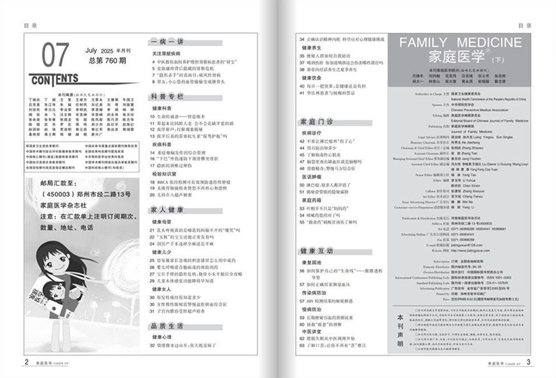 《家庭医学》杂志是一本专注于家庭健康的权威期刊,每期提供与家庭医学相关的最新研究,临床实践和健康生活建议。本杂志的目标是为普通读者提供易懂、实用且具有科学依据的健康信息,使他们能够更好地管理和维护自己和家人的健康。作为一本权威期刊杂志拥有一支由医学专家、研究人员和临床医生组成的编辑团队,他们负责评审和选取最优质、最具价值的研究论文,以及整理各类健康资讯。因此,每一期杂志都能提供最新、全面的医学知识和最新的研究成果。